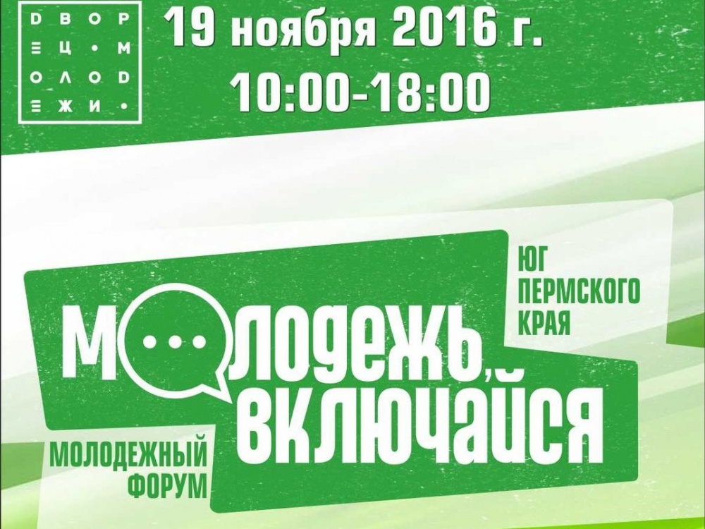 19 ноября во Дворце молодёжи стартует Форум юга Пермского края «Молодёжь, включайся!». Участники Форума - молодёжь Чайковского района, муниципалитетов юга Пермского края в возрасте от 16 до 25 лет (учащиеся школ, студенты, работающая молодёжь).