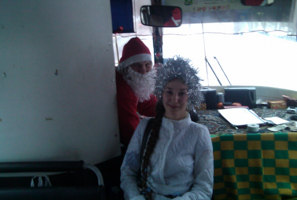 В Чайковском в первые дни нового года работники общественного транспорта порадовали своих пассажиров. Вместо привычного водителя вы могли увидеть за рулем пассажирского автобуса Деда Мороза, а вместо заурядного кондуктора - Снегурочку!