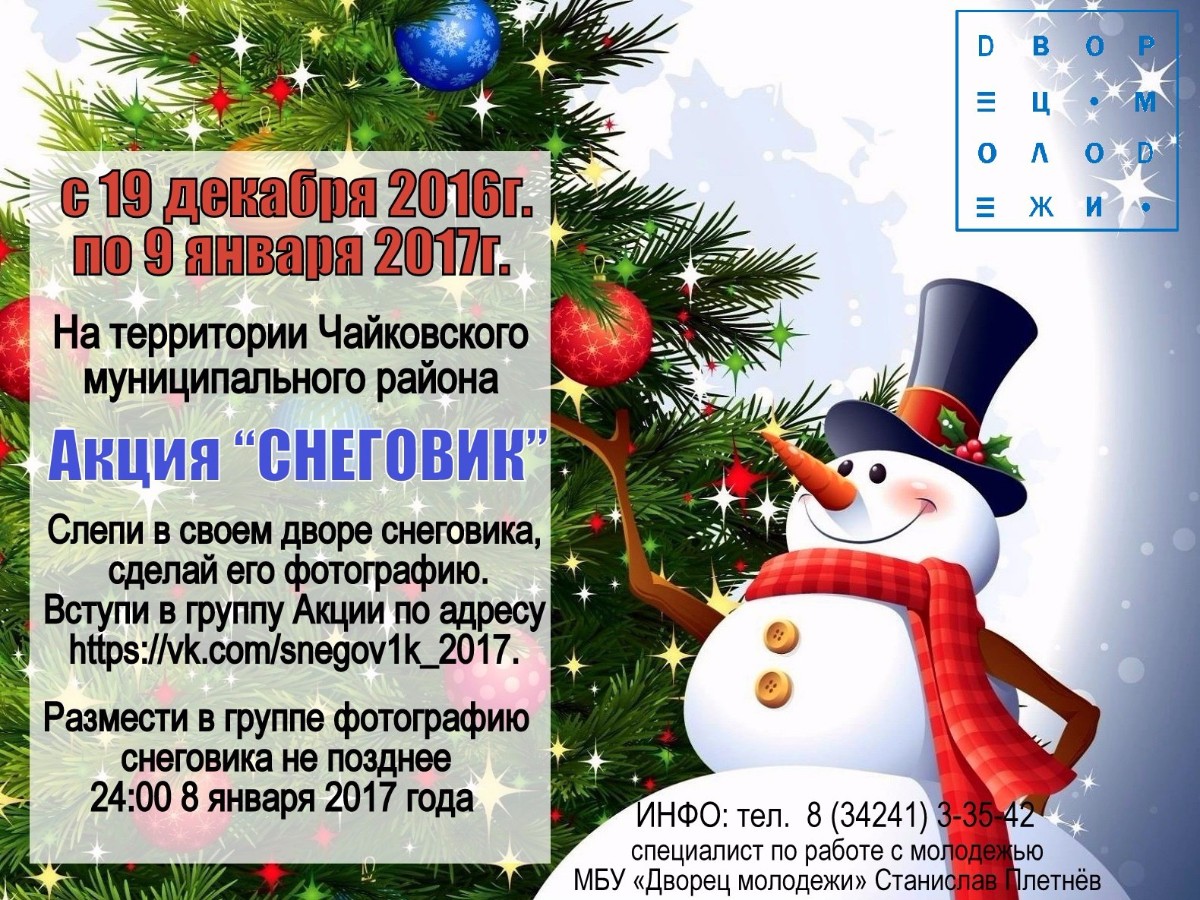 Время лепить снеговиков. Тем более что Дворец молодёжи объявил о старте акции «Снеговик», которая продлится до 9 января 2017 года. Для участия в ней приглашаются все жители Чайковского района, возраст участников – неограничен.