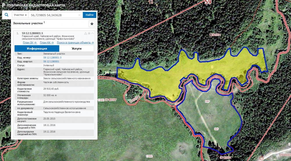 Действительно, два земельных участка сельхозназначения – один площадью 3,2 га с кадастровым номером 59:12:0490000:3 и второй площадью 2,8 га с кадастровым номером 59:12:0490000:849, расположены по обоим берегам реки Сайгатка в районе д. Русалевка, что хорошо видно на публичной кадастровой карте. Владелец этих участков на праве собственности – юрист птицефабрики «Чайковская» Вячеслав Ожгибесов. (фото карта)