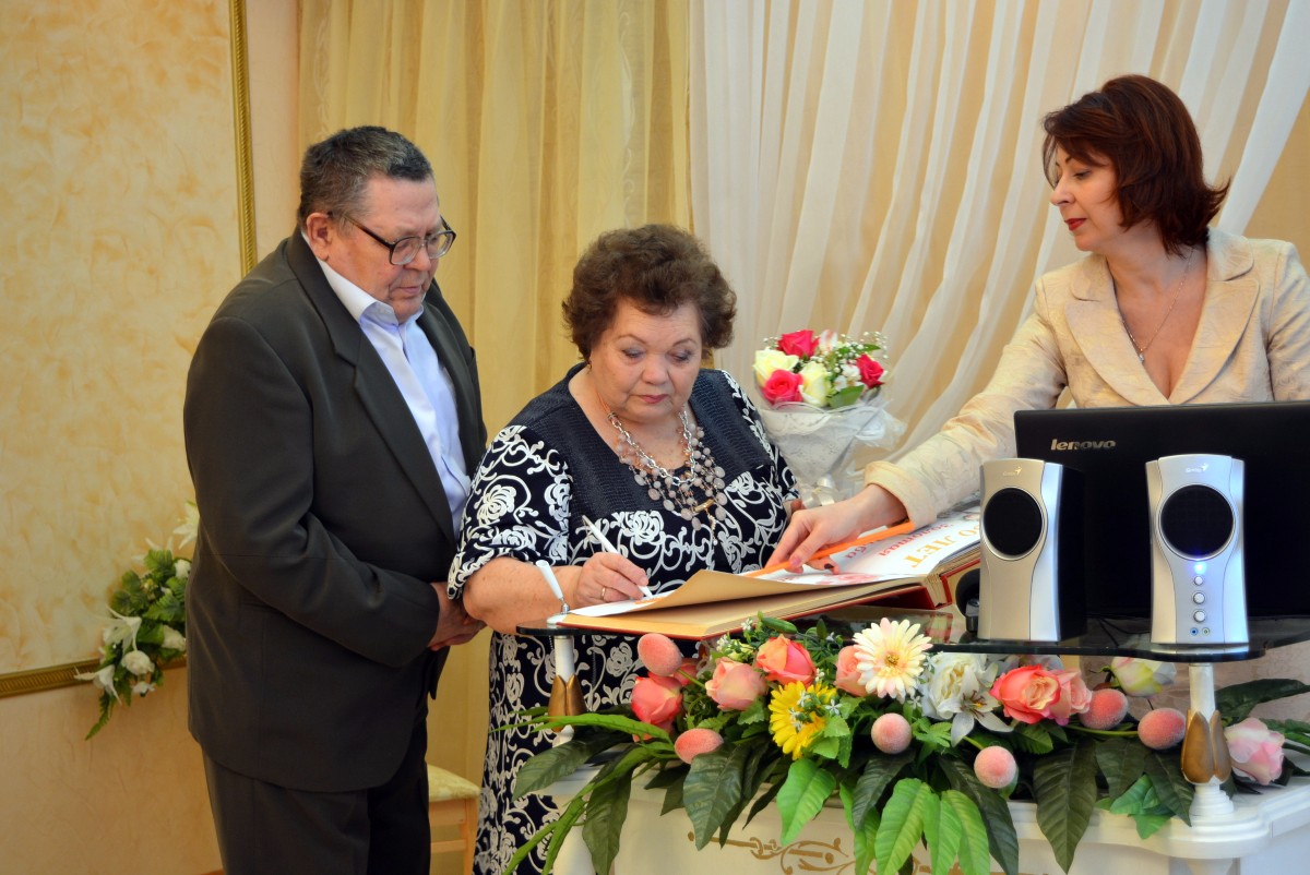 По традиции, существующей в отделе ЗАГС, супруги поставили свои подписи в книге почётных юбиляров, поздравили друг друга «золотым» поцелуем. Много тёплых слов прозвучало в этот день для виновников торжества от сотрудников отдела ЗАГС и гостей праздника.