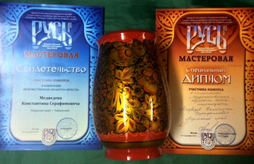 По результатам конкурса Константин Серафимович Медведев получил специальный диплом конкурса «Русь мастеровая». Также он подтвердил звание «Народный мастер России» в Союзе художников России в Москве.