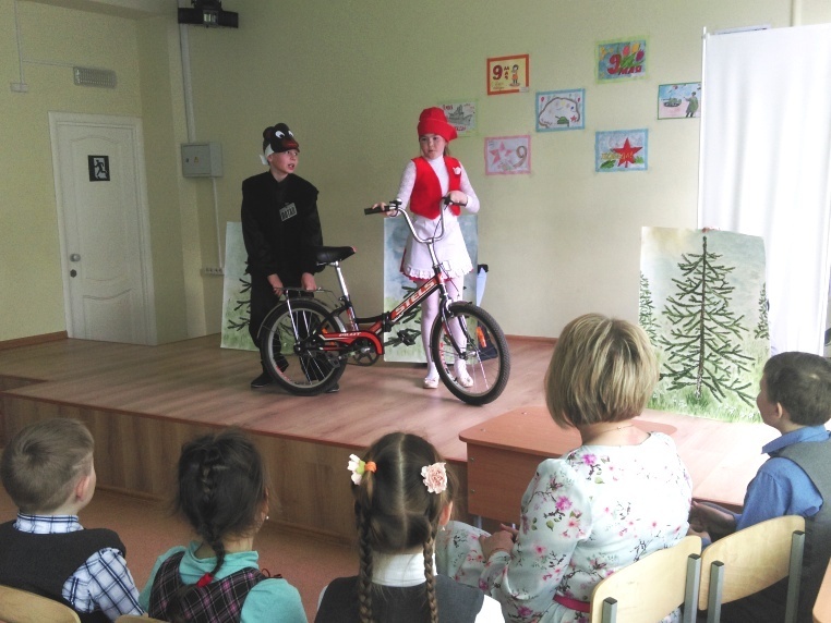 На сцене перед зрителями ребята разыграли картину, в которой Красной Шапочке подарили велосипед. Главная героиня, не раздумывая, поехала на нём к бабушке. На своём пути она встретила различные дорожные знаки, значения которых ей были неизвестны. На помощь девочке пришла бабушка, которая вручила Красная Шапочке газету «Добрая дорога детства». В ней девочка нашла все необходимые ей правила и обозначения. После этого главная героиня без труда преодолела дорогу домой.