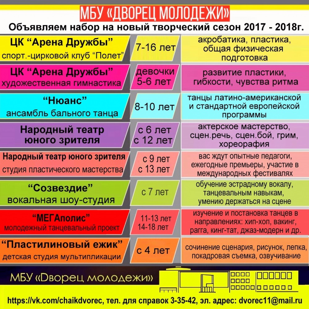 МБУ «Дворец молодёжи» объявил набор на новый творческий сезон 2017-2018 годы. У каждого юного чайковца есть возможность стать звездой сцены, городских, краевых и российских конкурсов, концертов, фестивалей.