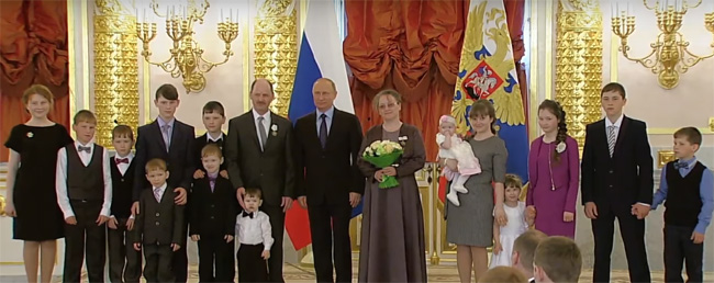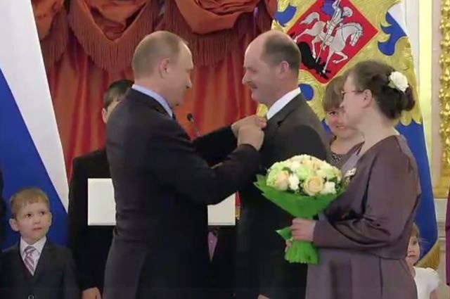 Накануне Дня защиты детей президент вручил ордена «Родительская слава» многодетным семьям, которые воспитывают семерых и более малышей и подростков. Среди награждённых – семья Богомоловых из города Александровск Пермского края. На церемонию в Кремль они, как и другие семьи, приехали в полном составе. Андрей и Оксана Богомоловы сыграли свадьбу 26 лет назад и сейчас воспитывают 14 родных детей – девять сыновей и пять дочерей. Владимир Путин вручил супругам ордена, после чего сфотографировался со всей семьёй из Прикамья.