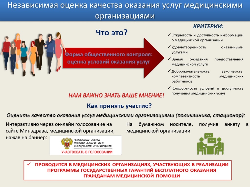 Свою оценку открытости и доступности информации в медицинской организации, комфортности условий, времени ожидания приёма, доброжелательности, вежливости, компетентности медработников и удовлетворенности оказанными услугами можно дать, перейдя по ссылке «Независимая оценка качества оказания услуг медицинскими организациями».