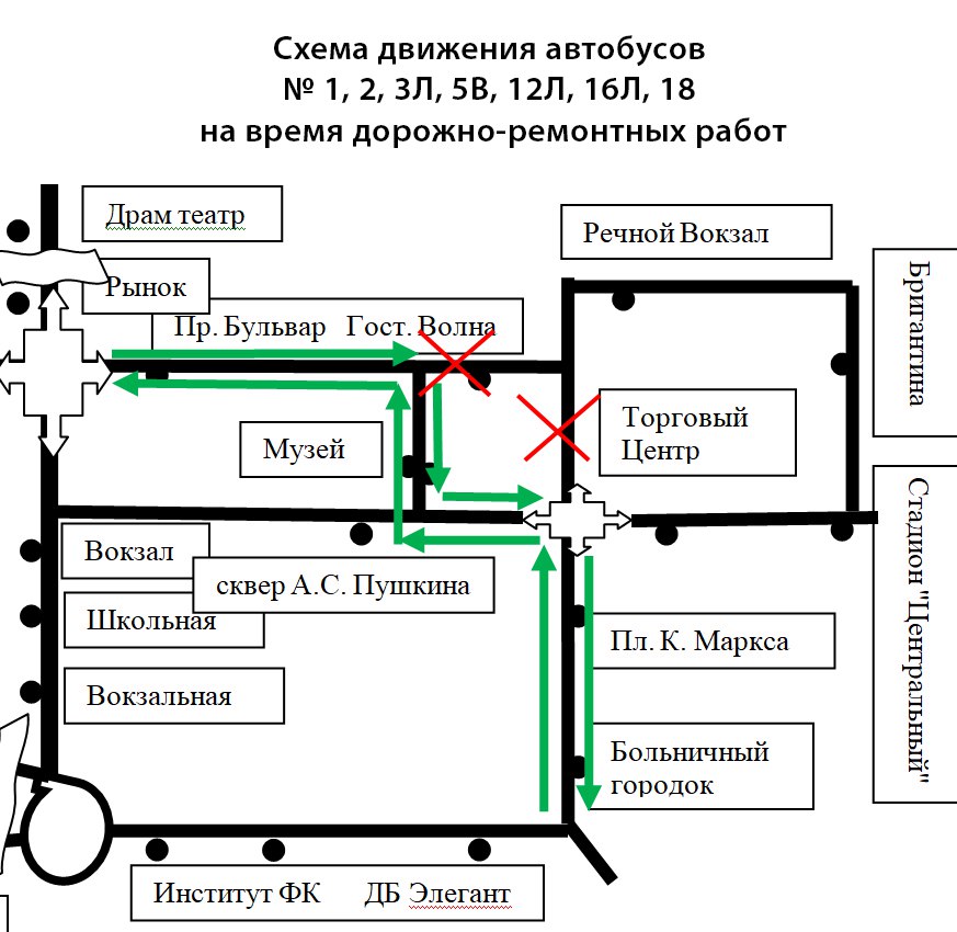 В четверг, 10 августа, будут запрещены движение и стоянка транспортных средств на участках автомобильной дороги от дома №9 по улице Ленина до пересечения с улицей Карла Маркса. Объезд участка дорожно-ремонтных работ – по автомобильным дорогам ул. Кабалевского, ул. Карла Маркса (схема движения автобусов по маршрутам 1, 2, 3Л, 5В, 12Л, 16Л, 18 на время проведения дорожно-ремонтных работ прилагается).