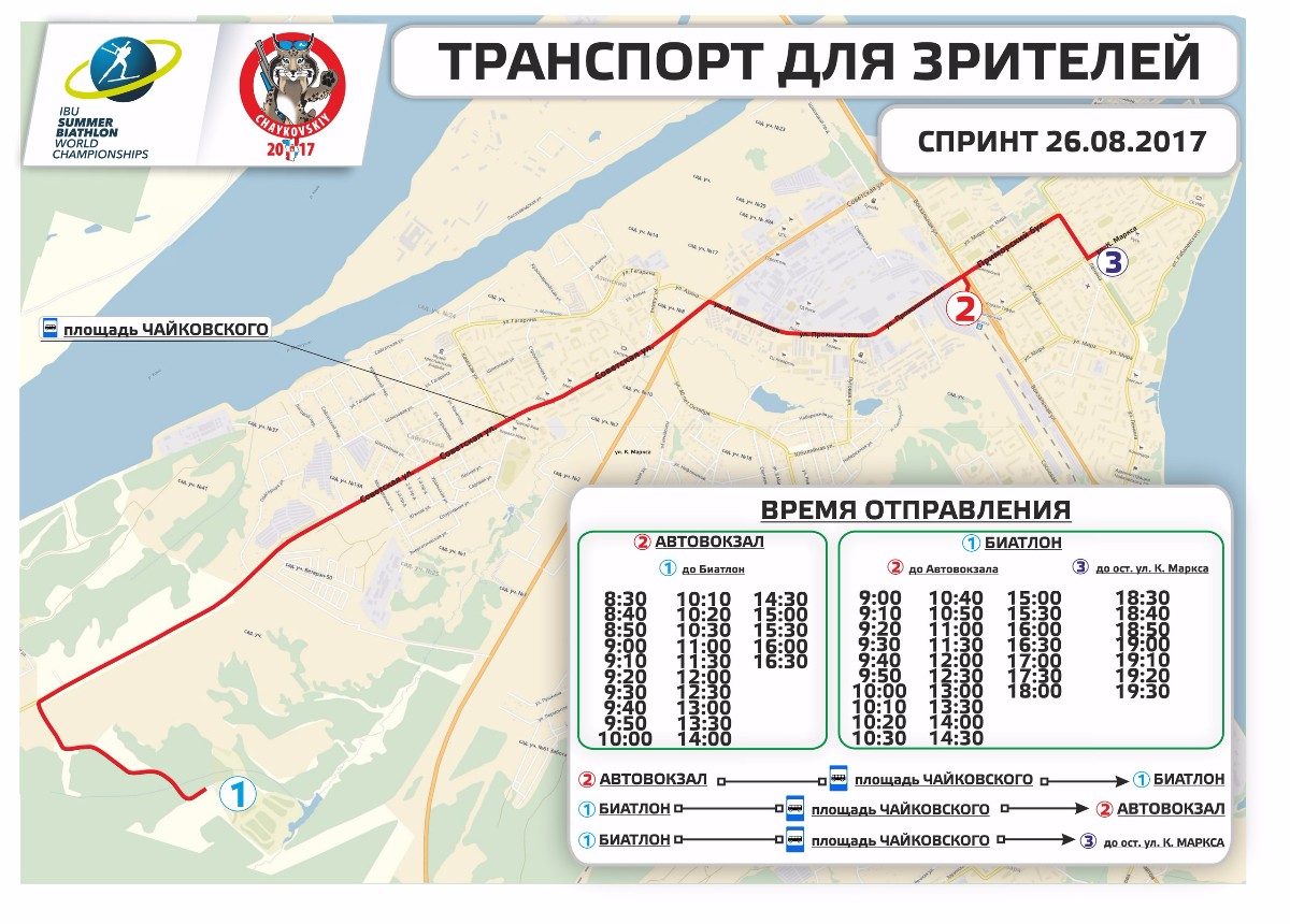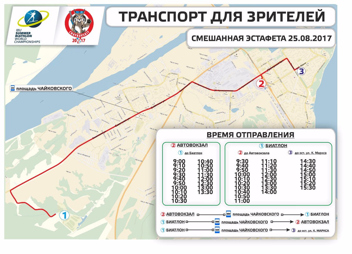 - до места проведения соревнований: Автовокзал, улица Азина, Пожарное депо, площадь Чайковского, Биатлонный комплекс.