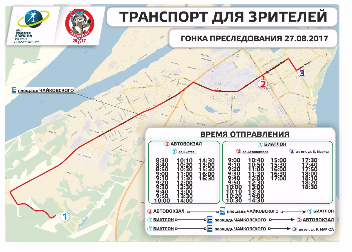 В период проведения Чемпионата мира по летнему биатлону в Чайковском будут курсировать автобусы. Транспорт доставит зрителей и поклонников биатлона от автовокзала до биатлонного комплекса ФЦП «Снежинка» и в обратном направлении 25, 26 и 27 августа.
