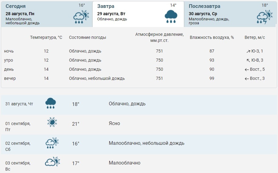 30 августа влияние малоподвижного фронта на погоду в южных районах края сохранится. По расчётам большинства прогностических моделей, дожди ожидаются не только по югу, но и по центральным районам края, а температура воздуха из-за плотной облачности не поднимется выше +15°.