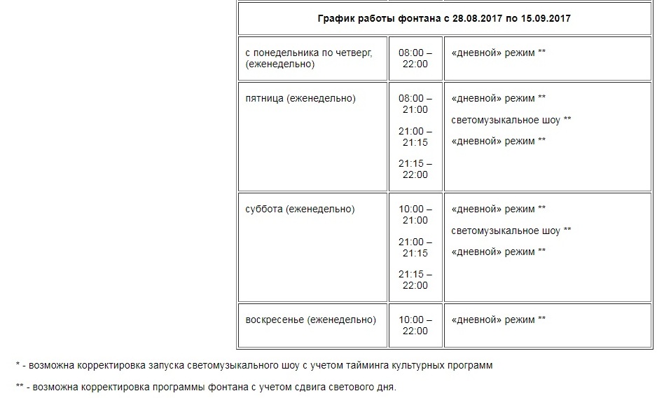 Представляем вашему вниманию режим работы фонтана до 15 сентября.