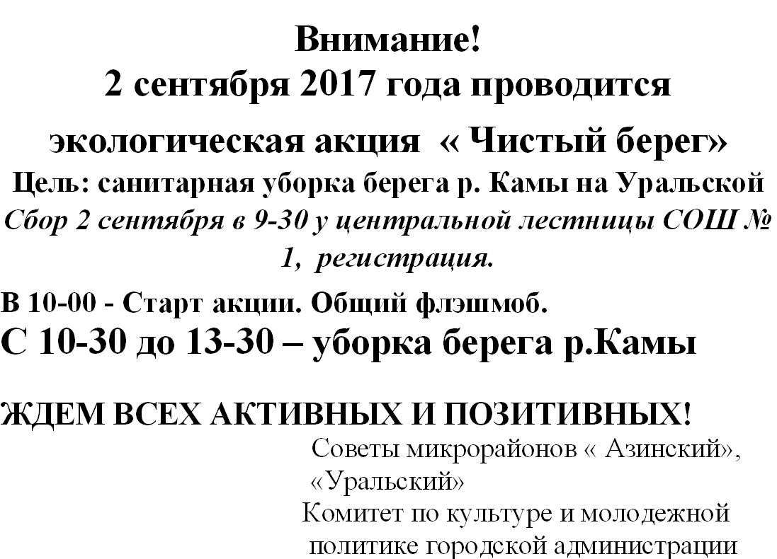 Также в этот день неравнодушных горожан и жителей микрорайонов «Азинский» и «Уральский» приглашают на экологическую акцию «Чистый берег». Цель акции – санитарная уборка берега реки Кама в районе канала шлюза. Сбор 2 сентября в 9:30 у центральной лестницы СОШ №1.