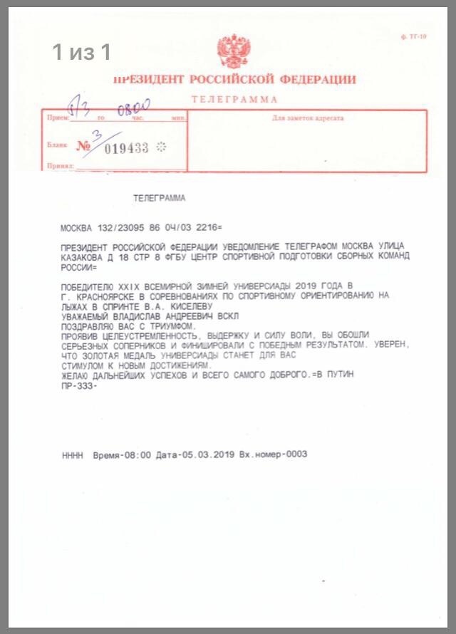 «Проявив целеустремлённость, выдержку и силу воли, Вы обошли серьёзных соперников и финишировали с победным результатом. Уверен, что золотая медаль Универсиады станет для Вас стимулом к новым достижениям», - говорится в поздравительной телеграмме, адресованной Киселёву.